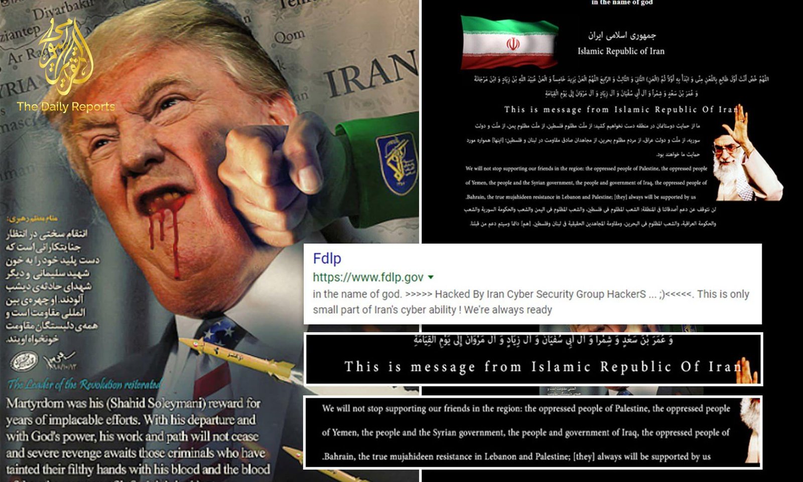 بعد وقت قصير من تأكيد وفاة سليماني ، قام محمد زاده “بنقل رمز الكمبيوتر إلى ما يقرب من 51 موقعًا إلكترونيًا مستضافة في الولايات المتحدة وتشويه تلك المواقع من خلال استبدال محتواها بصور الجنرال الراحل سليماني على خلفية العلم الإيراني ، إلى جانب الرسالة ، في وجاء في لائحة الإتهام “تسقط أمريكا” ونصوص أخرى “