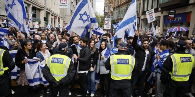 شارك الآلاف في مسيرة مؤيدة لإسرائيل في وسط لندن يوم الأحد بالقرب من سفارة البلاد ، بعد يوم من مظاهرة ضخمة مؤيدة للفلسطينيين في العاصمة البريطانية