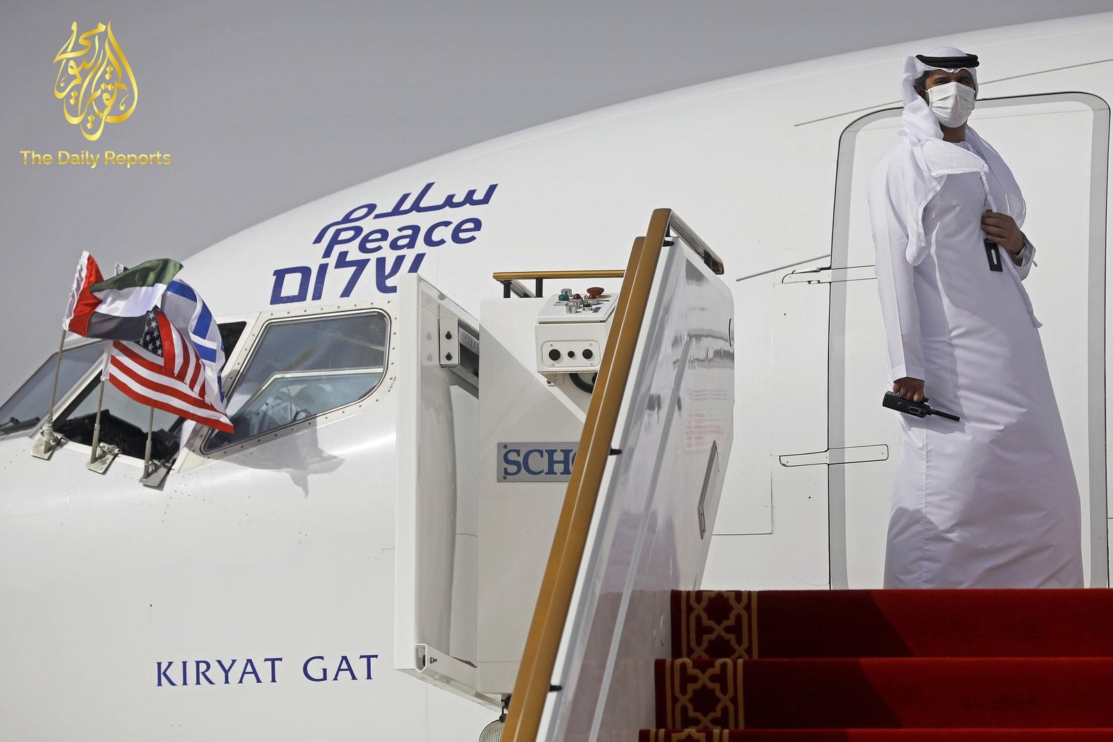 تمت كتابة كلمة “سلام” أيضًا باللغات العربية والإنجليزية والعبرية على قمرة القيادة في طائرة إل عال رقم LY971 التي هبطت في صالة كبار الشخصيات في عاصمة الإمارات ، حيث رفعت أعلام الولايات المتحدة بجانب لافتة نجمة داوود