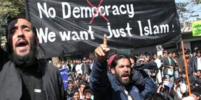 الديمقراطية ، من وجهة نظرنا الغربية ، تمنع الحكومة من إصدار قوانين تحظر حرية ممارسة الدين ، أو تنتقص من حرية التعبير ، أو حرية الصحافة ، أو الحق في التجمع السلمي ، أو الحق في تقديم التماس إلى الحكومة من أجل معالجة المظالم ، حتى تلك الدول التي تبنت هيكلاً “ديمقراطيًا” للحكومة ، مثل العراق ، مع وجود دستور ينص على أنه “لا يجوز سن قانون يتعارض مع مبادئ الديمقراطية” ، في نفس المادة (المادة 2 ، أ) وتقول: “الإسلام هو الدين الرسمي للدولة وهو مصدر أساسي للتشريع ، لا يجوز سَن قانون يتعارض مع أحكام الإسلام، ” في البلدان ذات التفكير المماثل ، مثل مصر والمملكة المغربية ، لا تزال هناك قوانين شديدة القسوة ، مثل عقوبة الإعدام على الرِّدَّة أو قمع حق الكلام والصحافة ، وهو لا يختلف عن قوانين إيران أو المملكة العربية السعودية حيث الشريعة هي القاعدة