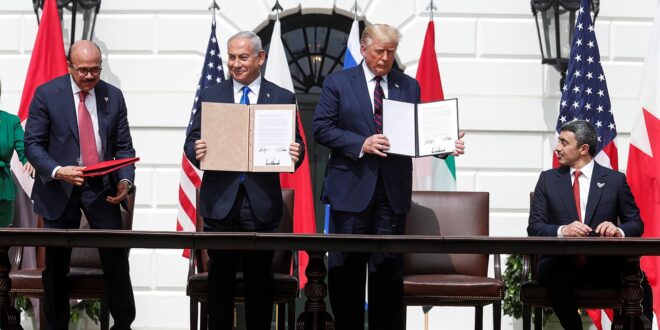 أبرم رئيس وزراء إسرائيل الأطول خدمة ووزيرا خارجية البحرين والإمارات العربية المتحدة الإتفاق التاريخي ، الذي أطلق عليه اتفاقيات إبراهيم ، بحفل توقيع استضافه الرئيس الأمريكي