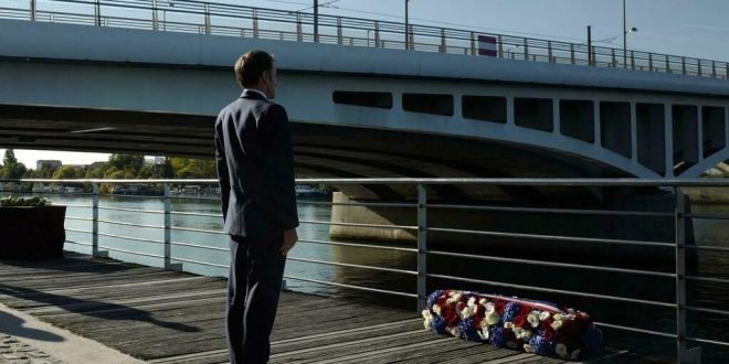 ووقف ماكرون، أول رئيس فرنسي يحضر مراسم تأبين القتلى، دقيقة صمت إحياء لذكراه عند جسر بيزونز على نهر السين في ضواحي باريس حيث بدأت الاحتجاجات