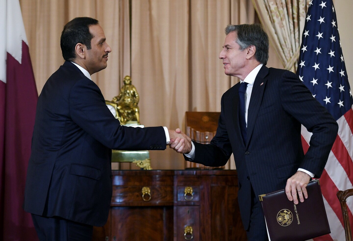 وفي ترحيبه بنظيره القطري لواشنطن، وقع وزير الخارجية أنتوني بلينكين اتفاقية تنص على أن دولة قطر هي القوة الحامية للولايات المتحدة في أفغانستان “مع حليف الخليج لإنشاء قسم للمصالح الأمريكية في سفارتها في كابول