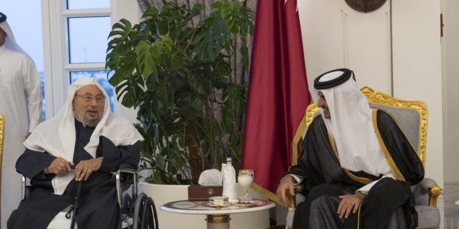 يمكن رؤية الأمير القطري الشيخ تميم حاوية الشيخ يوسف القرضاوي وهو يقبل رأس المبشر الذي وصف اليهود بـ “الشمبانزي والخنازير” في مقال وزعته الصحيفة العربية 14 مايو