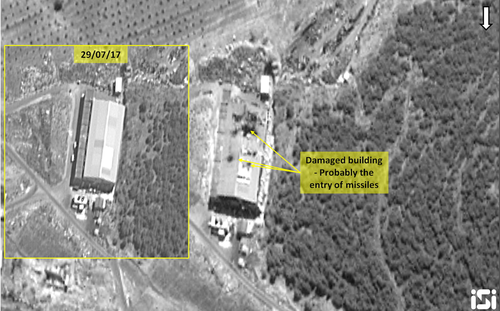 وأظهرت الصور التي نشرتها شركة Aurora Intel العديد من المباني المدمرة في مجمع مركز الدراسات والبحوث العلمية في مدينة مصياف شمال غرب سوريا. استُهدفت لجنة SSRC بضربات جوية إسرائيلية مزعومة عدة مرات، بما في ذلك غارة نهارية نادرة في أوائل أبريل