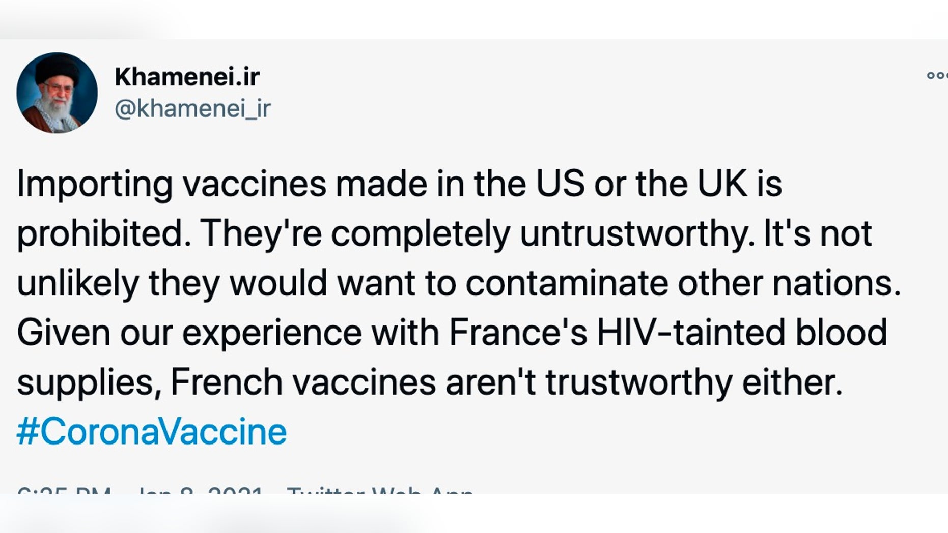 وأضاف الزعيم الإيراني في تغريدة مع هاشتاغ #CoronaVaccine نظرًا لتجربتنا مع إمدادات الدم الملوثة بفيروس نقص المناعة البشرية في فرنسا ، فإن اللقاحات الفرنسية ليست جديرة بالثقة أيضًا”