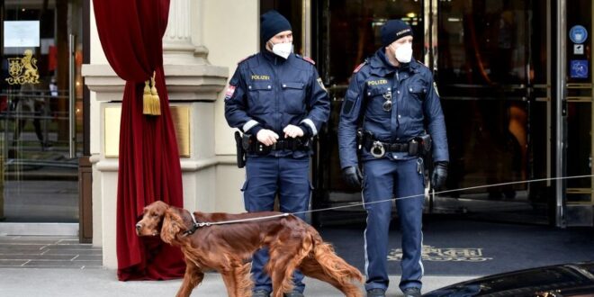 A dog passes by policemen guarding the entrance to the Grand Hotel Wien during the closed-door nuclear talks with Iran in Vienna on April 16, 2021, where diplomats of the EU, China, Russia and Iran hold their talks. - The US participates in discussions in Vienna to try to save the international agreement on Iranian nuclear power. However, they don't meet at the same table as Tehran and it is the Europeans who will serve as intermediaries between the two parties, in the hope of achieving concrete results after two months of impasse. (Photo by JOE KLAMAR / AFP)