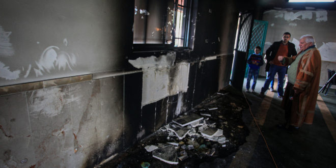 قال صحفيون فلسطينيون إن النقوش العبرية المرسومة بالرش على أحد الجدران الخارجية المتفحمة للمسجد كتب عليها “حصار للعرب وليس لليهود” و “أرض إسرائيل لشعب إسرائيل”