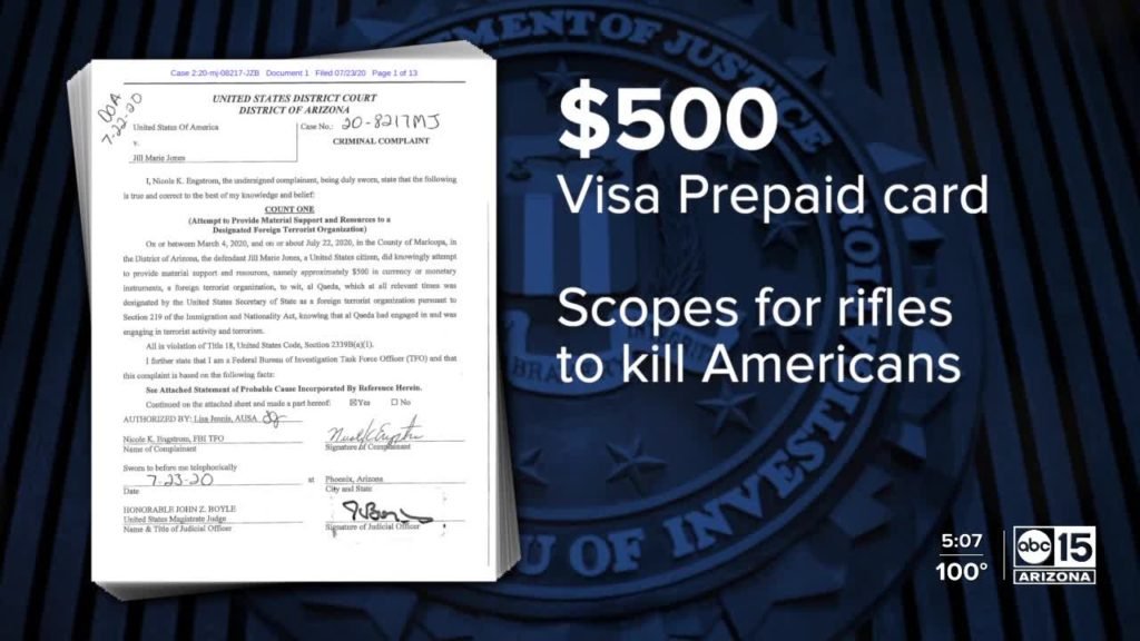 The FBI said Jones utilized a $500 prepaid gift voucher bought at Walmart to send cash to the covert FBI representative, who later gave Jones a photograph of a rifle with a degree, saying it was what her cash purchased.