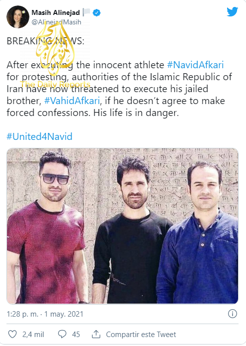 Saeed Afkari, hermano de Navid, Habib y Vahid, transmitió a través de Twitter las quejas de sus hermanos en contra del aislamiento, las palizas a las que son sometidos a diario y las amenazas de asesinato de dos altos funcionarios del régimen.