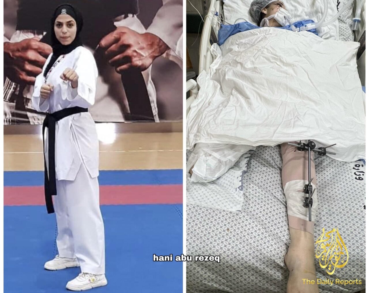 Depuis son enfance, elle a rarement été vue sans son uniforme. Elle a remporté la première et la deuxième place aux championnats palestiniens de karaté en 2017 et 2019. Aujourd’hui, elle gît dans l’unité de soins intensifs de l’hôpital Al Aqsa Martyr, dans le centre de Gaza, à Deir Al Balah, inconsciente. Sa jambe droite a été amputée.