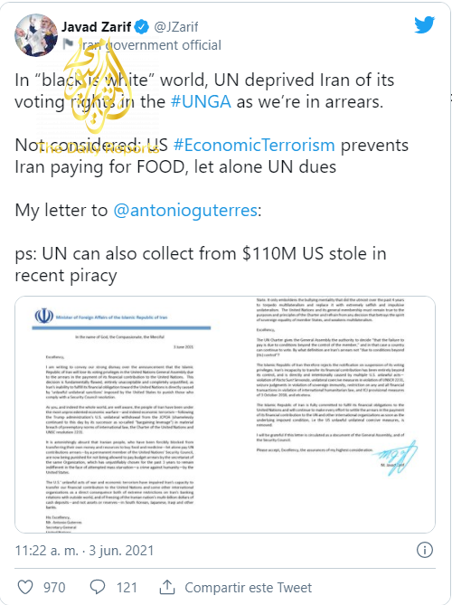 El jueves, el ministro iraní de Asuntos Exteriores, Javad Zarif, envió una carta al director general de Naciones Unidas, Antonio Guterres, en la que manifestó su consternación por la pérdida del derecho de voto.