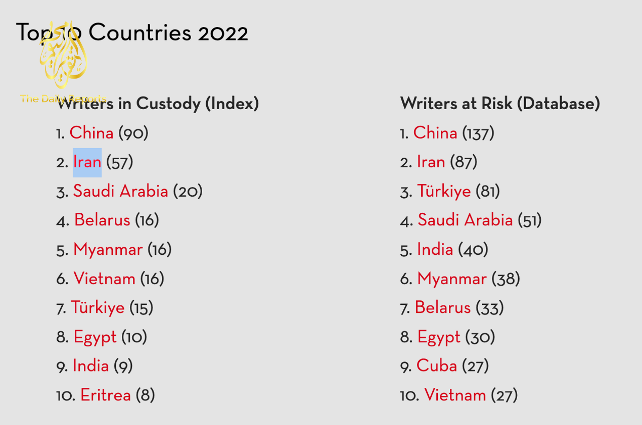 Según el último Índice de Libertad para Escribir de PEN America, Irán ocupa el segundo lugar a nivel mundial en encarcelamiento de escritores, detrás de China.