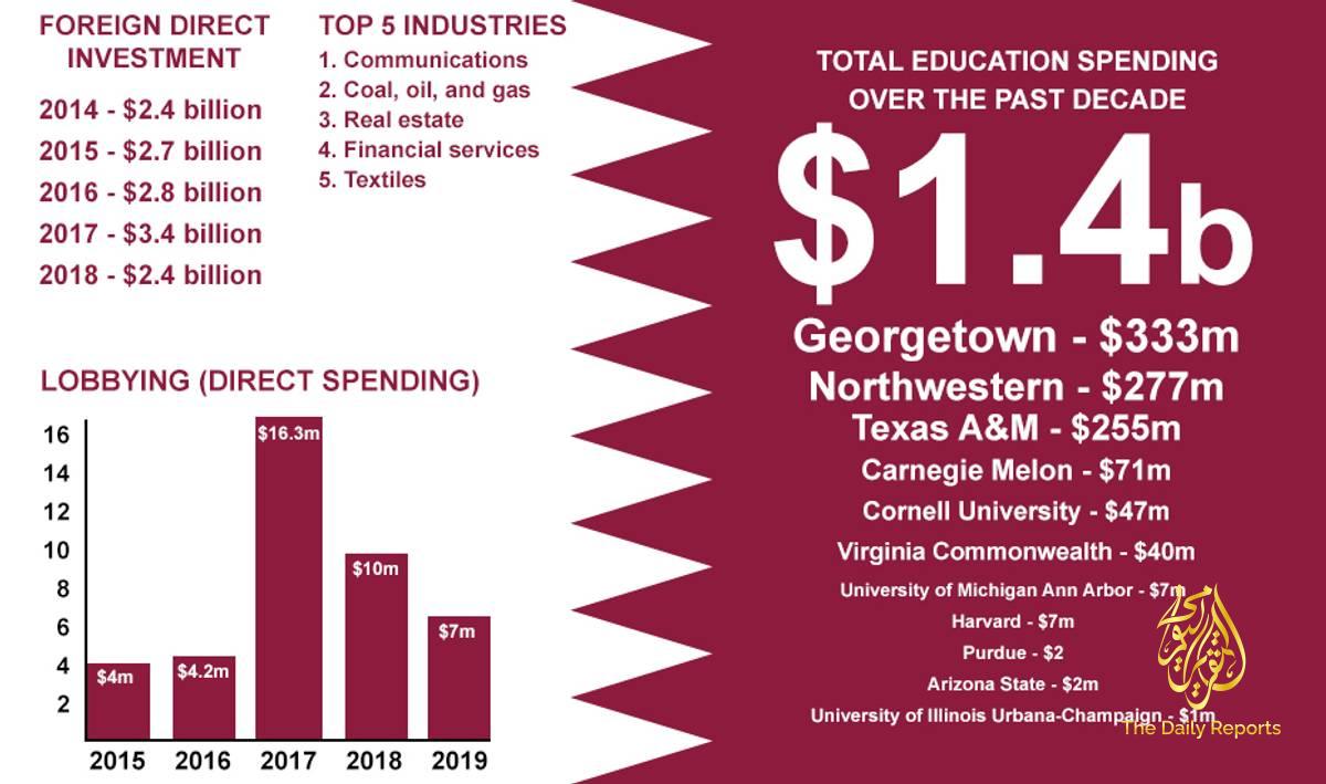 La base aérienne d’Al Udeid et Al-Jazeera sont devenues les fondations sur lesquelles le Qatar a construit sa campagne de lobbying mondiale. Vient ensuite une sélection triée sur le volet des grandes universités américaines, apparemment choisies à la fois pour leurs propres domaines d’excellence et pour leurs emplacements stratégiques aux États-Unis, et qui ont également ouvert des campus à Doha. Selon un rapport de 2016, le Qatar dépense plus de 400 millions de dollars par an pour soutenir les campus de Doha de six universités américaines : Carnegie-Mellon, Georgetown, Northwestern, Texas A&M, Weill Cornell Medical College, un avant-poste de la faculté de médecine de l’Université Cornell, et Virginia Commonwealth Campus des arts de l’université.